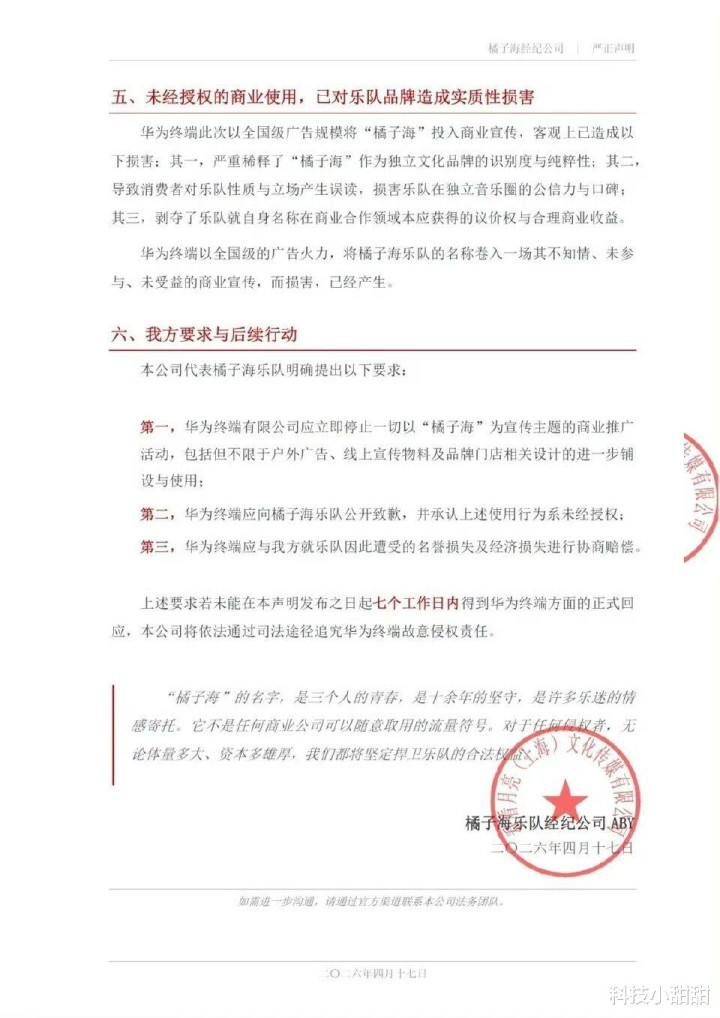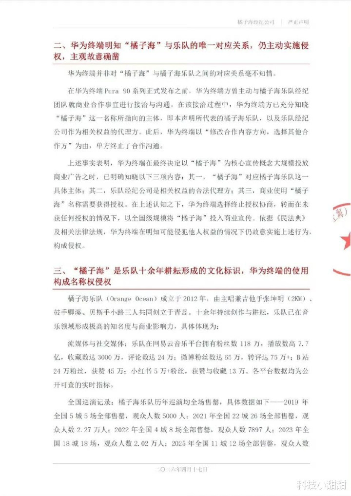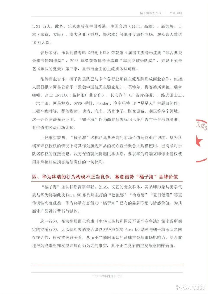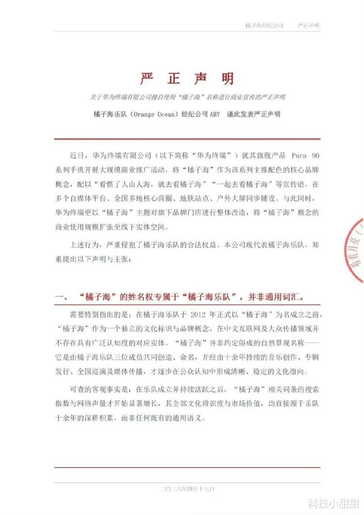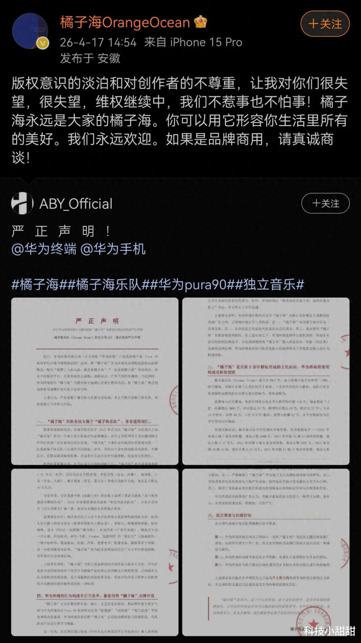 4月17日,橘子海乐队通过官微和经纪公司发出严正声明:指控华为Pura 90系列侵权。