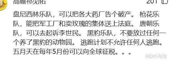 网友表示:盘尼西林乐队,可以把各大药厂告个破产。 唐朝乐队,可以去起诉李世民。 黑豹乐队,不要放过任何一个养了黑豹的动物园。 逃跑计划不允许任何人逃跑。 五月天在每年5月份可以向全球征税……